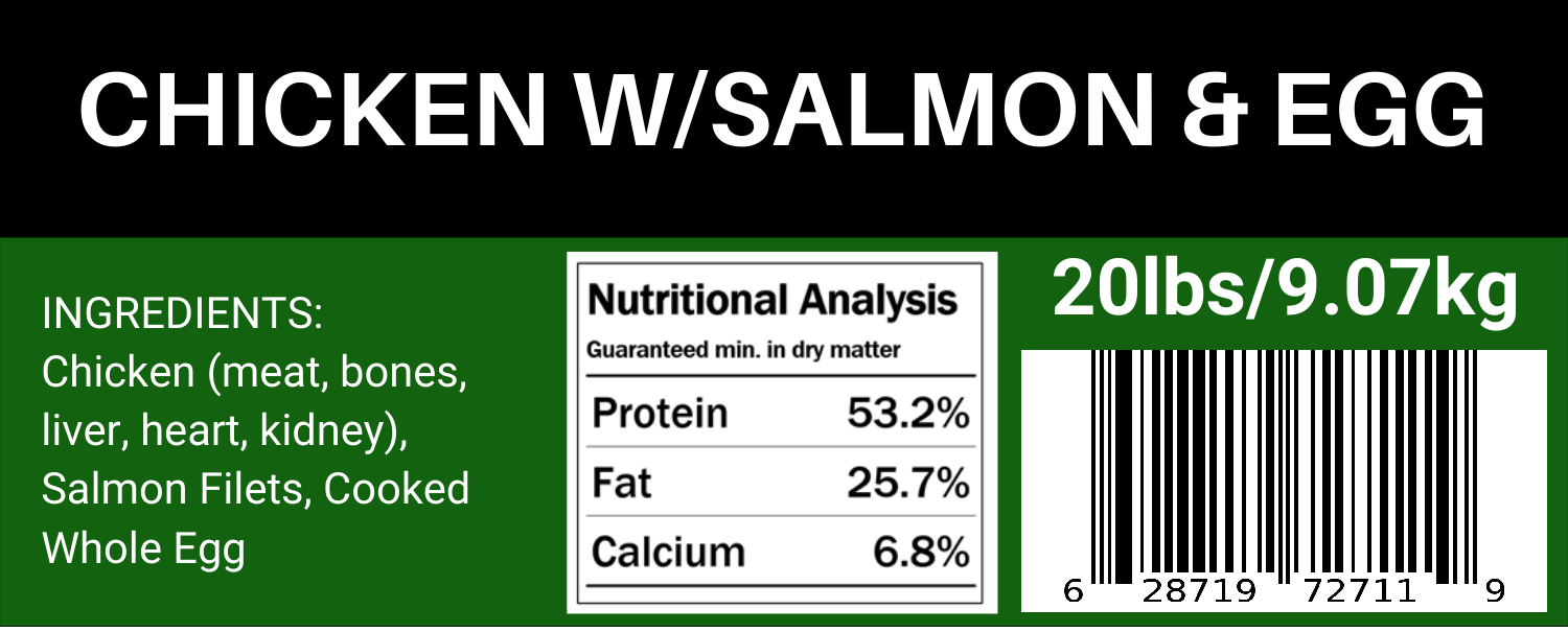 This recipe consists of 50% Bone-In Chicken (10% high-value chicken heart, liver and kidney organ meat), 30% Wild Pacific Salmon and 20% Whole Cooked Egg.