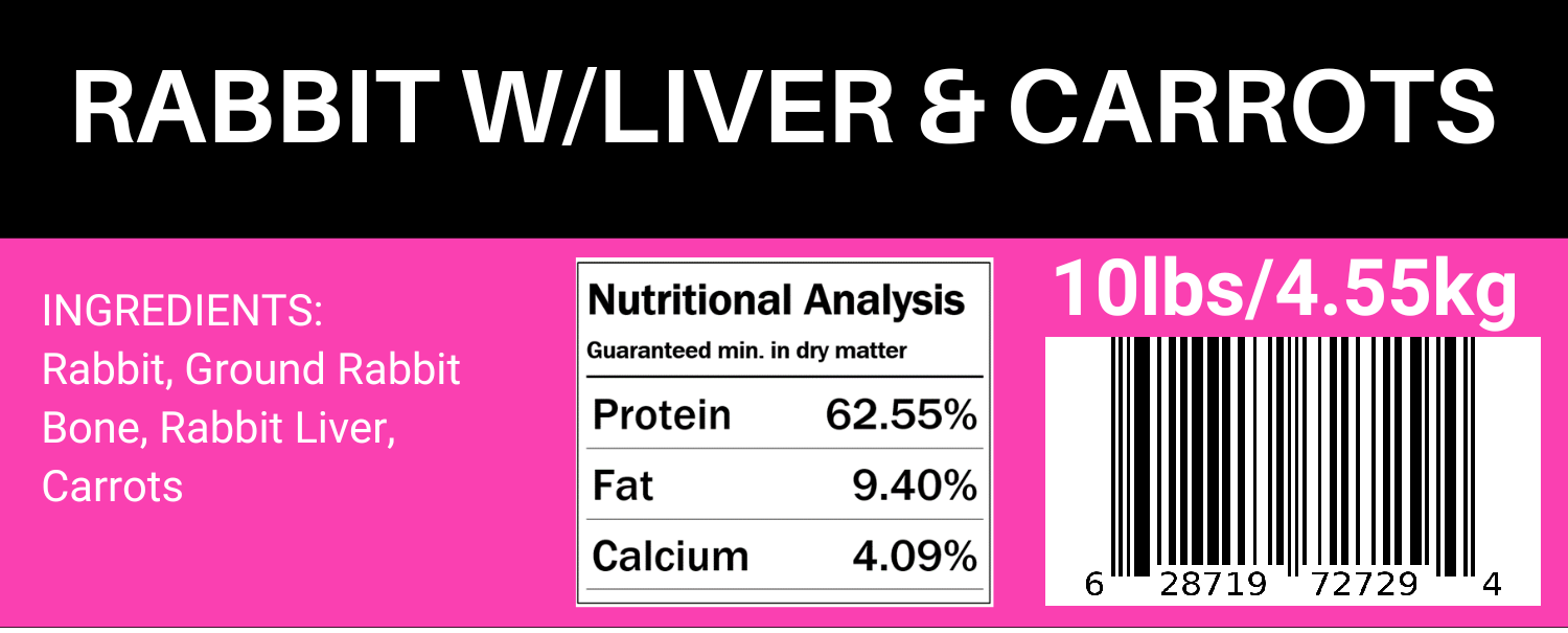 This recipe consists of 90% Bone-In Rabbit Meat, 5% Rabbit Liver and 5% Fraser Valley Carrots.