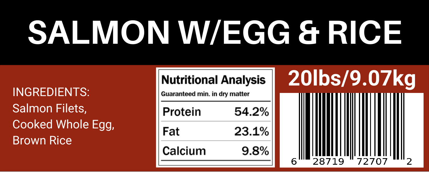 This recipe consists of 60% Wild Pacific Salmon, 30% Whole Egg and 10% Brown Rice.